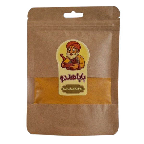 تهیهشده از بهترین ریشه های زرد چوبه مزاع هندوستان، با رنگ طلایی، عطر قوی و طعم اصیل ادویه ای ضروری برای غذاهای ایرانی، هندی و شرقی که علاوه بر طعم دلپذیر، خاصیت ضدالتهابی و آنتی اکسیدانی نیز دارد.\r\nترکیبات: زردچوبه آسیاب شده ۱۰۰ درصد خالص\r\n\r\nتولید و بسته بندی: برند باباهندو