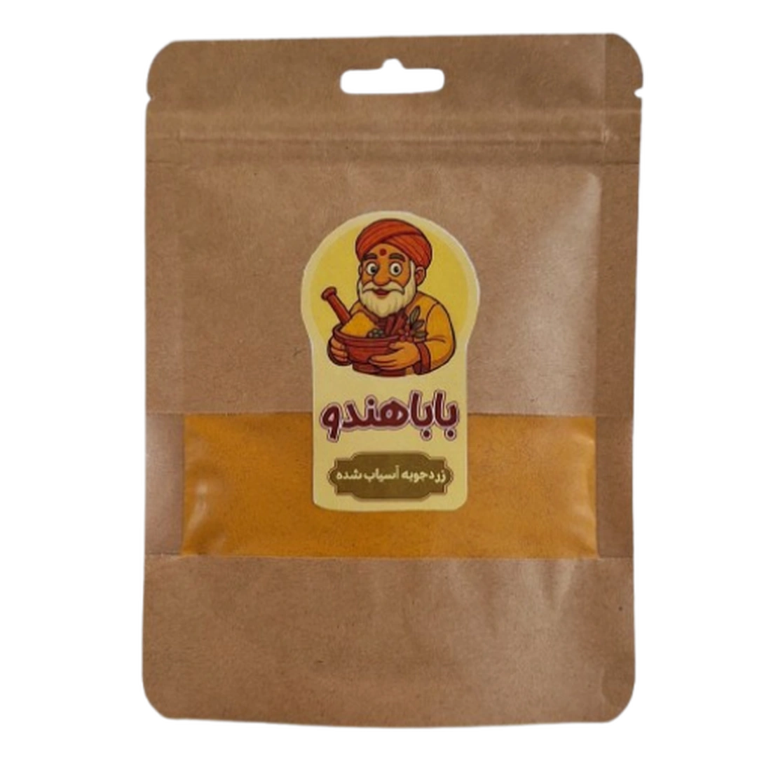 تهیه‌شده از بهترین ریشه های زرد چوبه مزاع هندوستان، با رنگ طلایی، عطر قوی و طعم اصیل ادویه ای ضروری برای غذا‌های ایرانی، هندی و شرقی که علاوه بر طعم دلپذیر، خاصیت ضدالتهابی و آنتی اکسیدانی نیز دارد.\r\nترکیبات: زردچوبه آسیاب شده ۱۰۰ درصد خالص\r\n\r\nتولید و بسته بندی: برند باباهندو